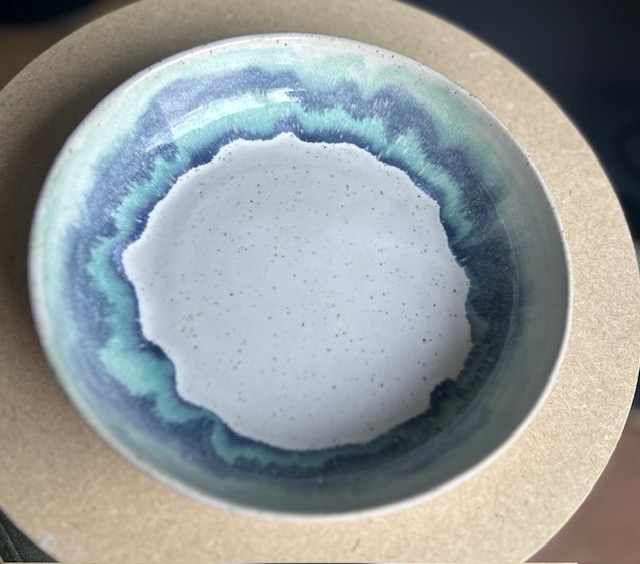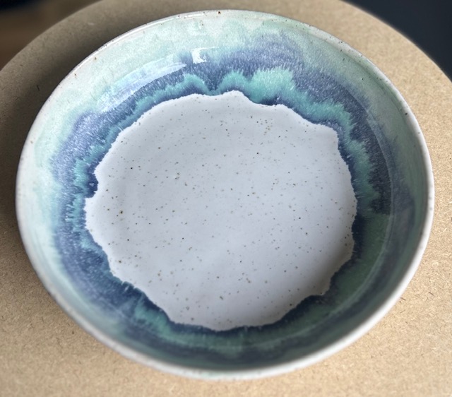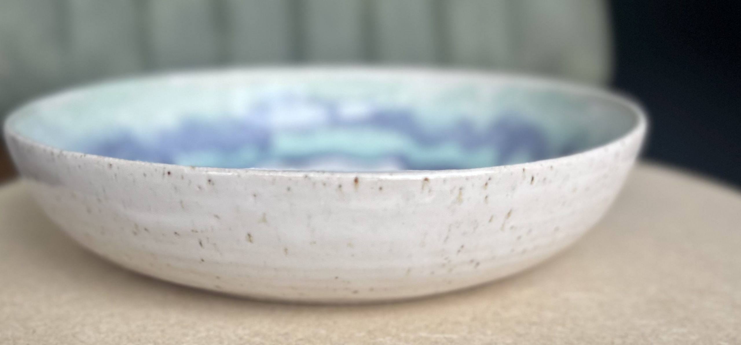 This beautiful serving bowl is perfect for your dining table. Glazed in blue and green over an opal white, on stoneware clay, this bowl is dishwasher safe.